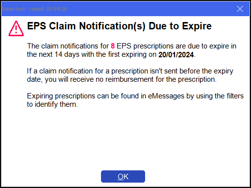 On start-up, Pharmacy Manager informs you if a reimbursement claim expiry is imminent for any prescriptions, for example, within 14 days of their expiry: