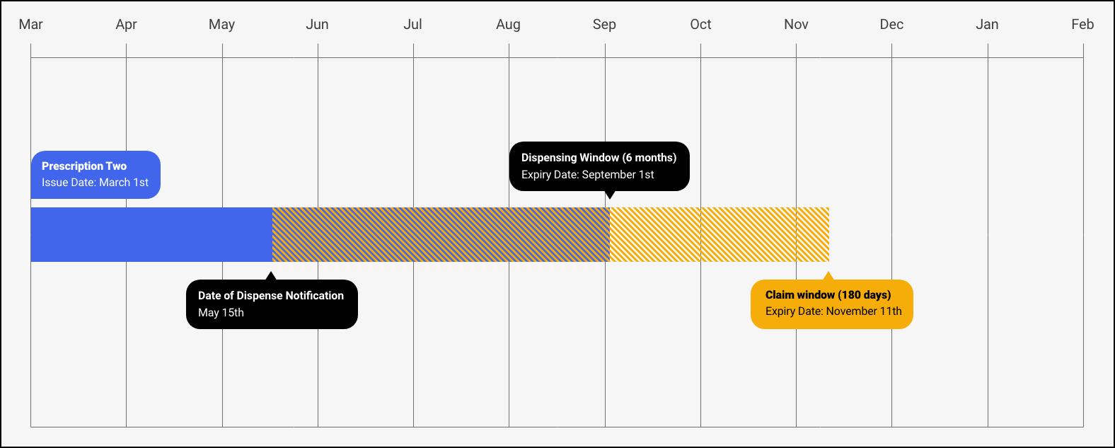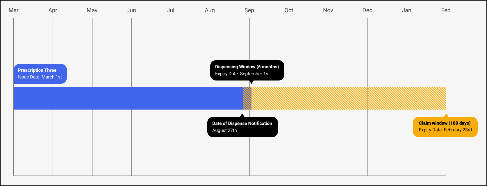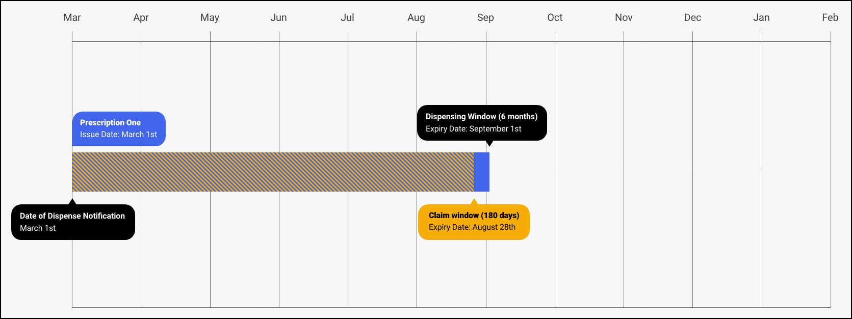 The prescription is dispensed and a notification is sent on the 1st of March therefore the claim window is set as the 28th August, 180 days after date of dispense.