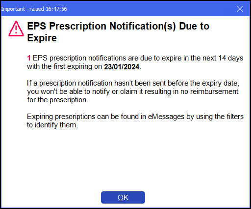 On start-up, Pharmacy Manager informs you if a dispense notification expiry is within 14 days for any prescriptions: