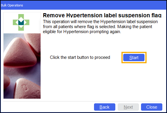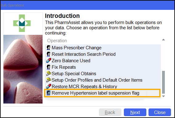 The Bulk Operations screen displays, select Remove Hypertension label suspension flag and then select Next