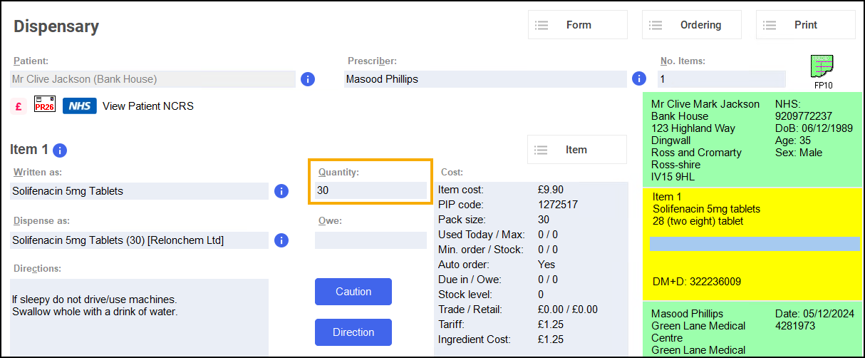 When dispensing an electronic prescription on the Dispensary screen, edit the Quantity to the actual quantity dispensed.