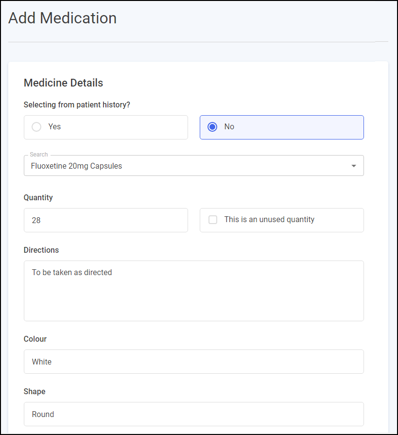 Quantity - If you have selected from the patient history this automatically completes, if not, complete as required.