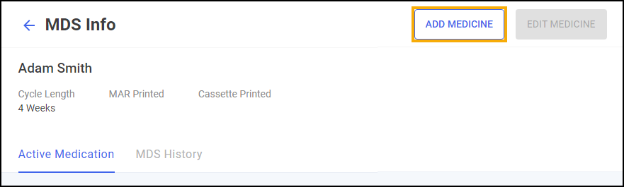From the MDS Info - Patient screen, select ADD MEDICINE