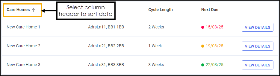 In the Care Homes tab, Care Homes display alphabetically by default. To manually sort the care homes simply select a column header to sort Oldest to Newest / A-Z