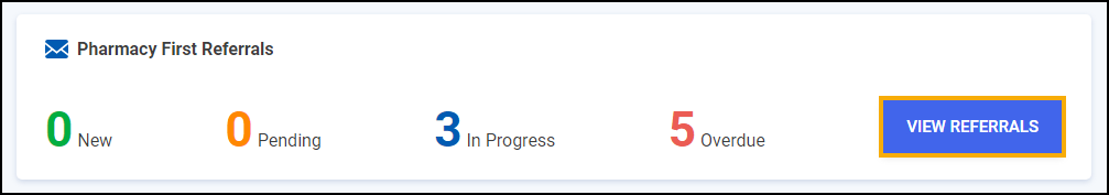 The Pharmacy Manager Intelligent Dashboard - A Pharmacy First Referrals tile displays on the Pharmacy Manager Intelligent Dashboard providing an at a glance overview of the number of referrals and their current status.