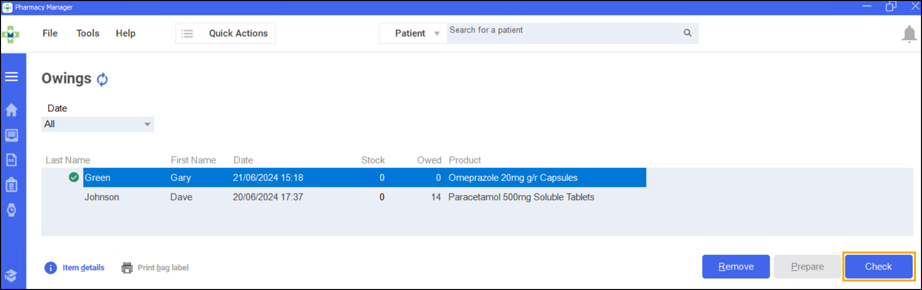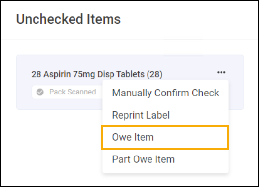 Owings created on the Dispensary screen display on the Accuracy screen, however if you have fully dispensed an item and then find that you do not have it in stock you can create an owing from the Accuracy screen.