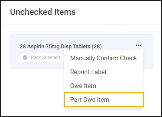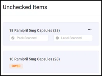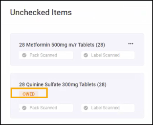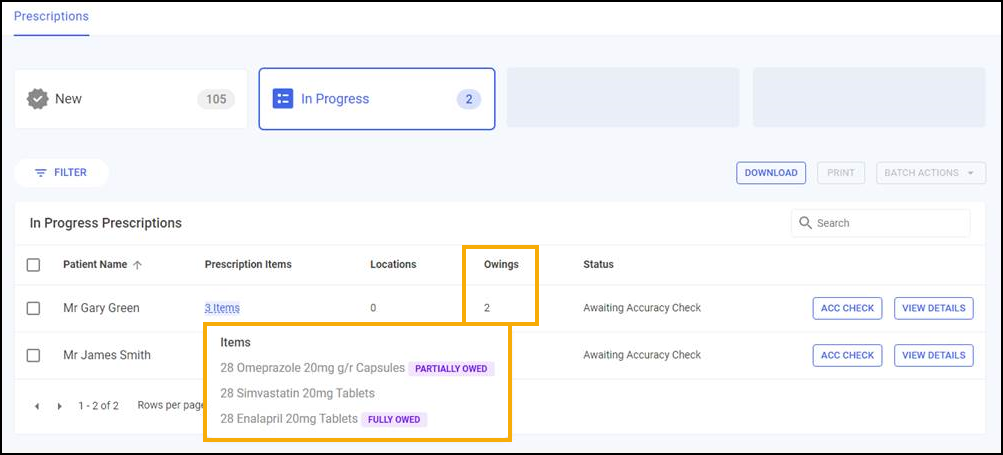 On the Prescriptions - In Progress screen, the Owings column displays the number of owings in the grouping, select the Prescription Items hyperlink to view which items are owed, either fully or partially.