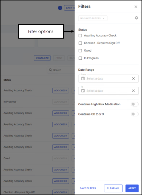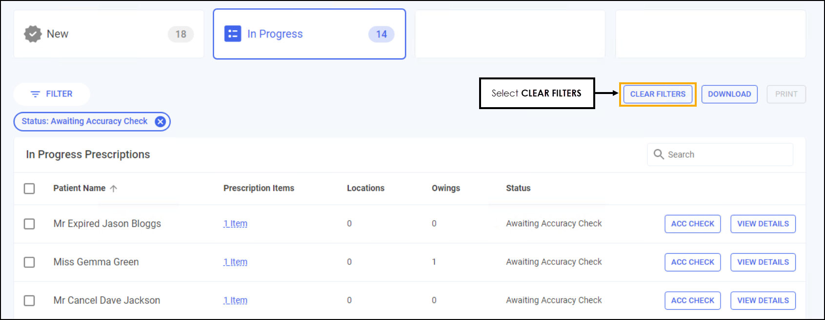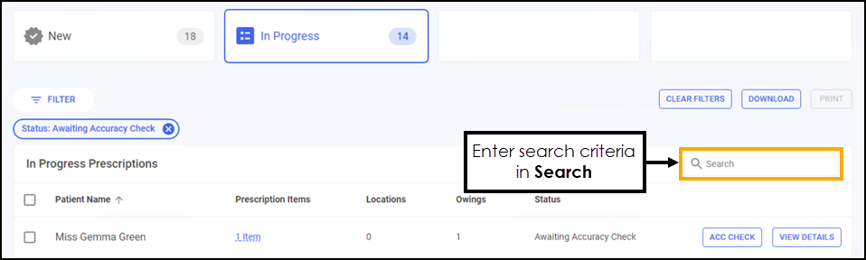 To help manage your workload you can search for or filter the prescriptions in progress, for example, to display prescriptions that are accuracy checked but require a pharmacist’s sign off.