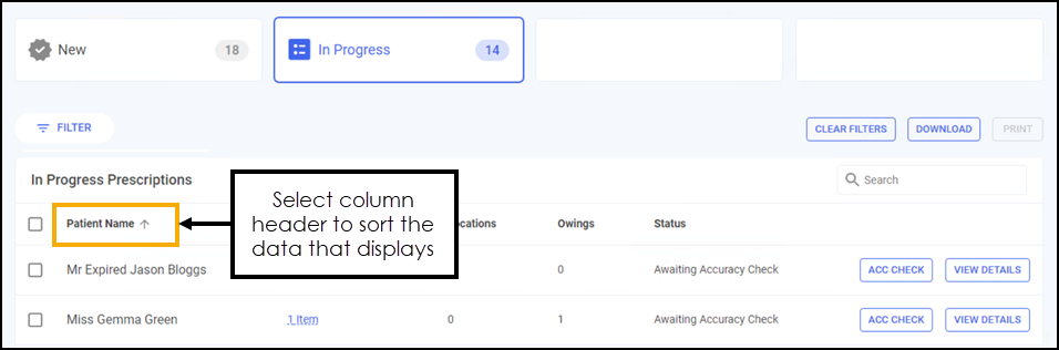Prescriptions in progress display newest first by default, to manually sort the prescriptions then simply select the column header to sort ascending / A-Z or descending / Z-A.