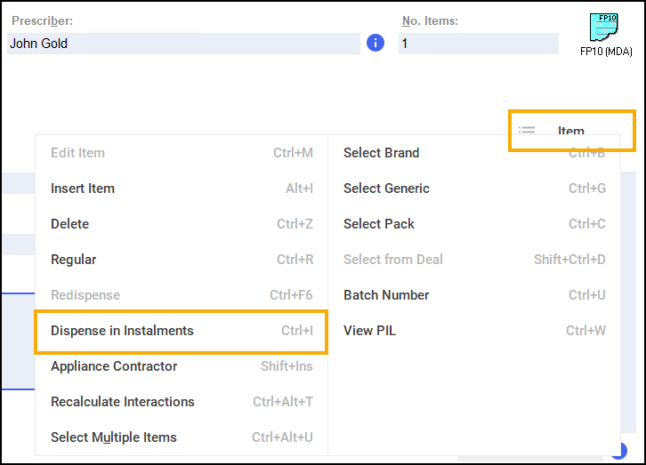 3. From Item, select Dispense in Instalments or press Ctrl + I on your keyboard: