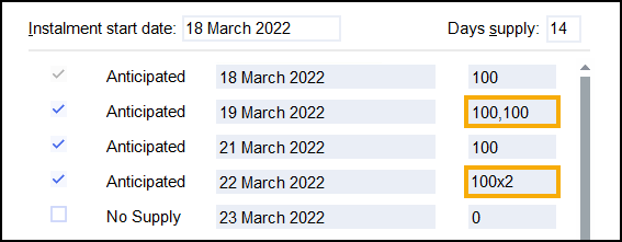 3. In the above example, two instalments are to be dispensed on one label. If two labels are required, enter the appropriate quantity separating with a comma, for example, '100,100', to produce two labels of 100. Similarly you can enter '100x2':