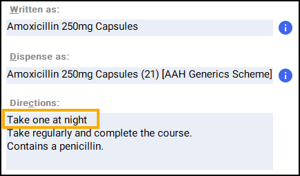 Enter the directions, for example, Take one at night: