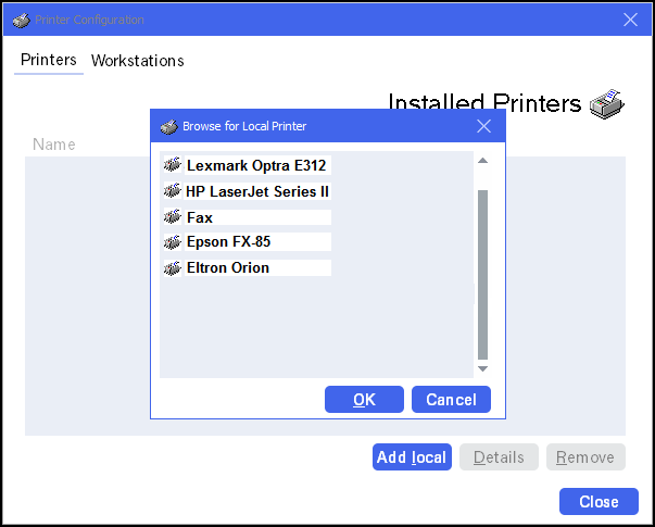 - Select the printer you wish to configure, if it is not listed, select Add Local, highlight the printer required and select OK.