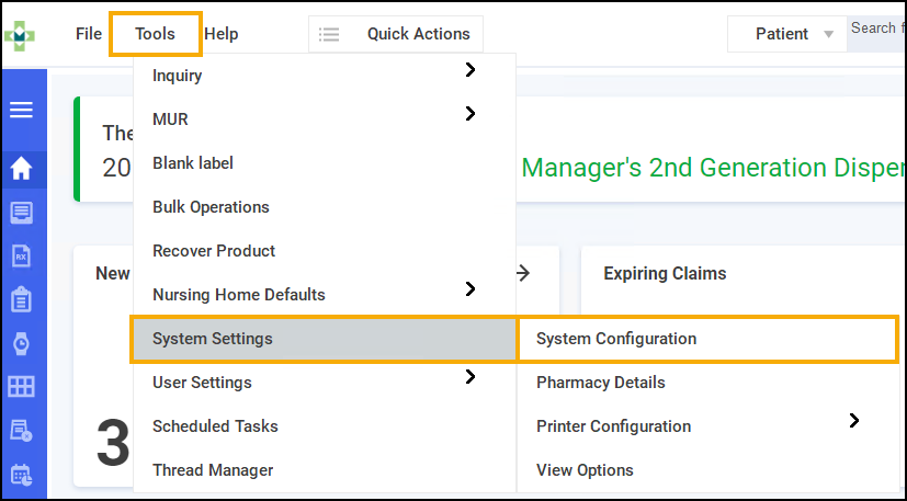 - From Pharmacy Manager, select Tools - System Settings - System Configuration: