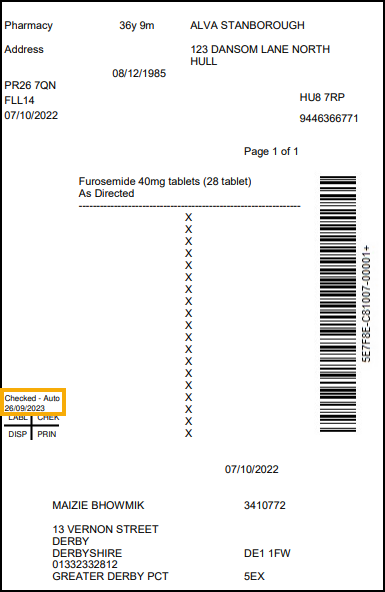 If a dispensing token is printed after an automated clinical check has taken place, Checked - Auto and the date of the check display on the dispensing token: