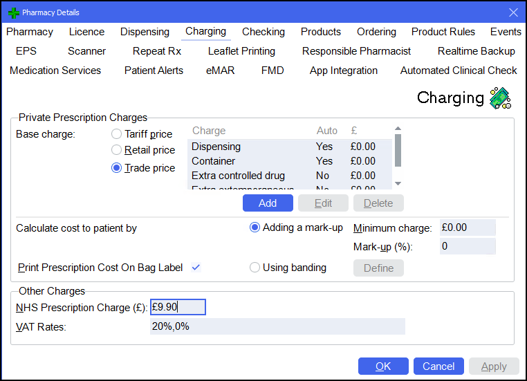 The Charging tab displays the default charges to apply to both NHS and private prescriptions.