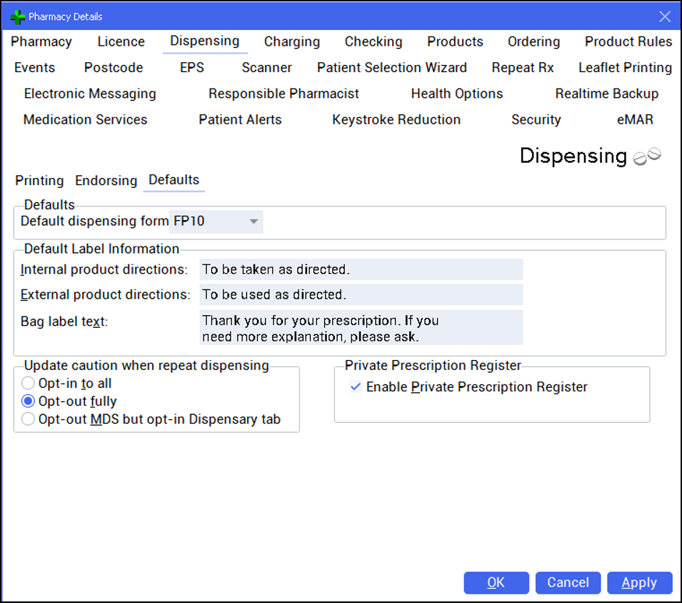 Note - If you have selected custom bag labels, Bag label text is superseded, see Custom bag labels for details. - Update caution when repeat dispensing - This sets how any updates for Cautions is handled on