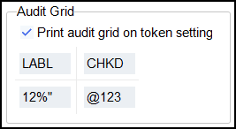 Print audit grid on token setting - Select to print an audit grid on the dispensing token. Enter the text to print on the grid, with a maximum of four characters per text box, for example.