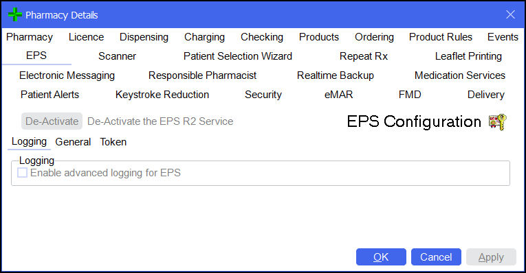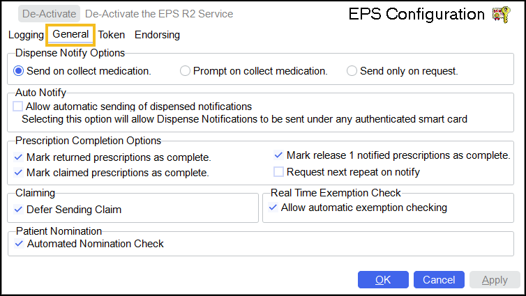 The EPS tab allows you to configure your Electronic Prescription Service (EPS) prescriptions.