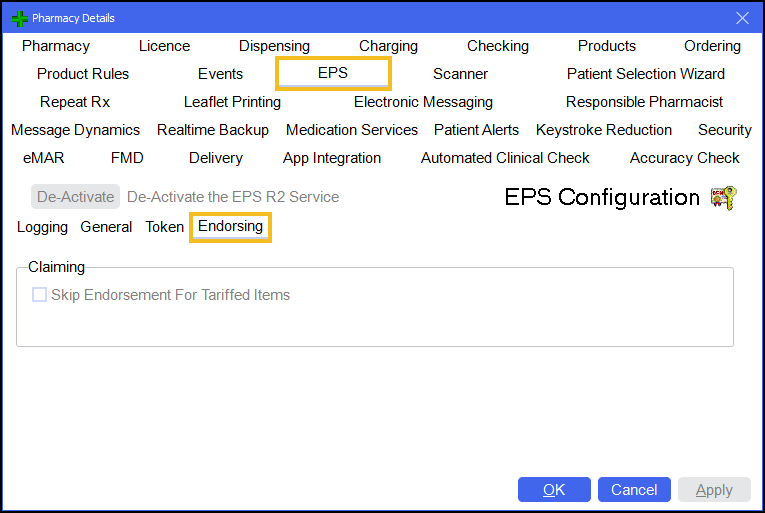 Skip Endorsement For Tariffed Items - Skip endorsements prior to sending a claim for EPS prescriptions where an endorsement is not required by the NHSBSA, and the exemption does not require additional confirmation, for example if the patient is age or RTEC exempt.