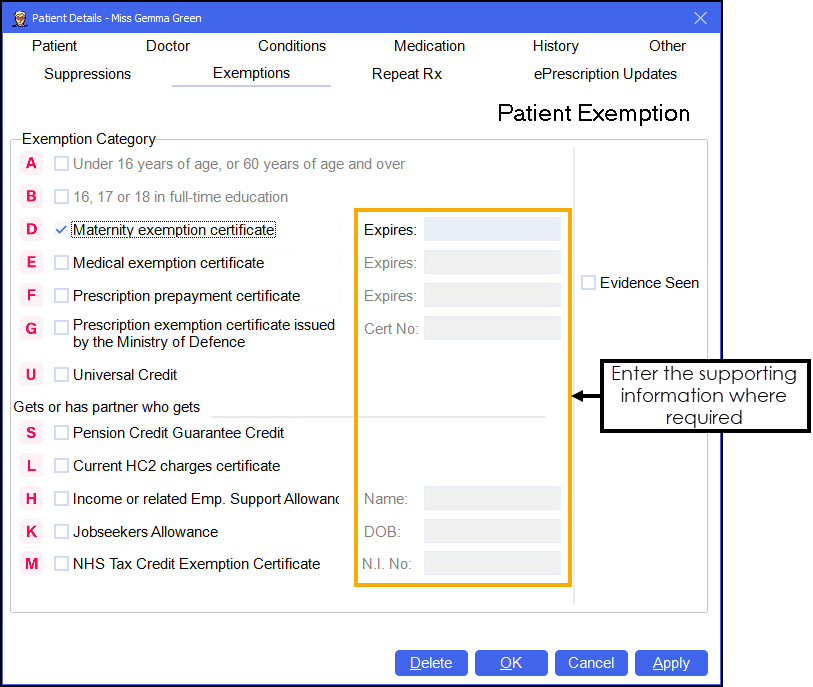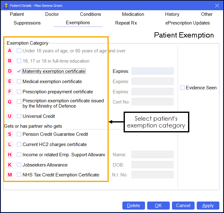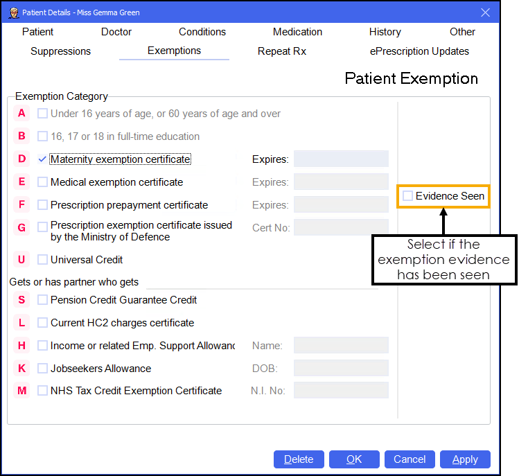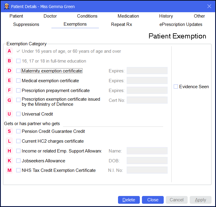 From the Patient Details - Exemptions tab you can easily set a patient's exemption status: