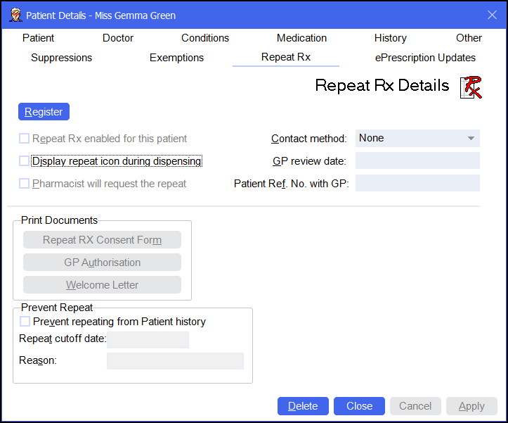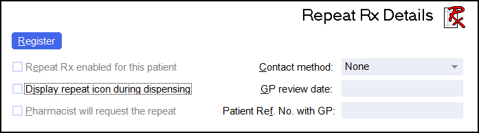 Register - Select to register this patient for Repeat Rx, see Registering a Patient for Repeat Rx for details.
