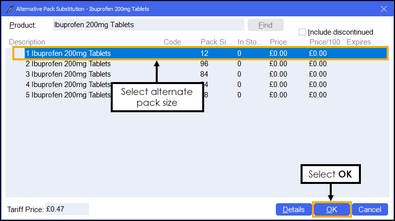 Training Tip - In this example where Ibuprofen 200mg Tablets (16) are prescribed, Pharmacy Manager will dispense Ibuprofen 200mg Tablets (12) instead.To select a different item select Find