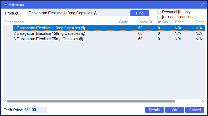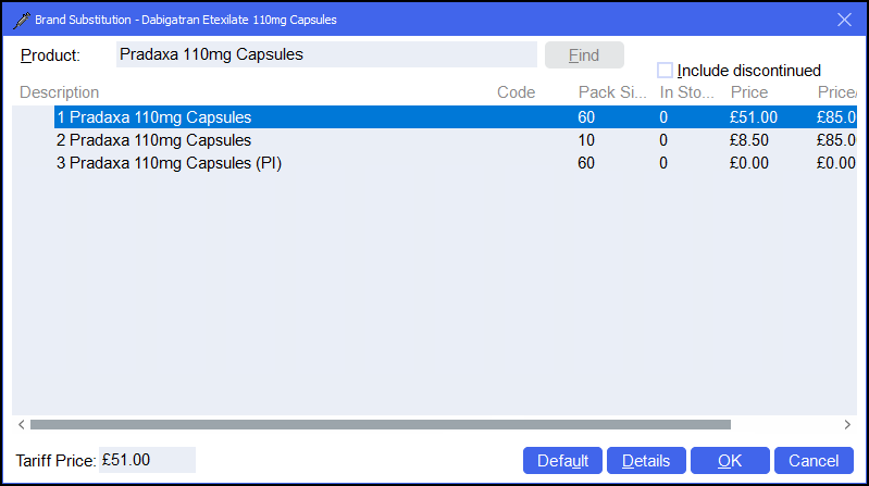 In this example there is no dispensing policy in place however this generic item is not available and a Brand, in this case Pradaxa, should be dispensed: