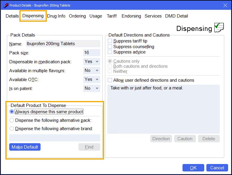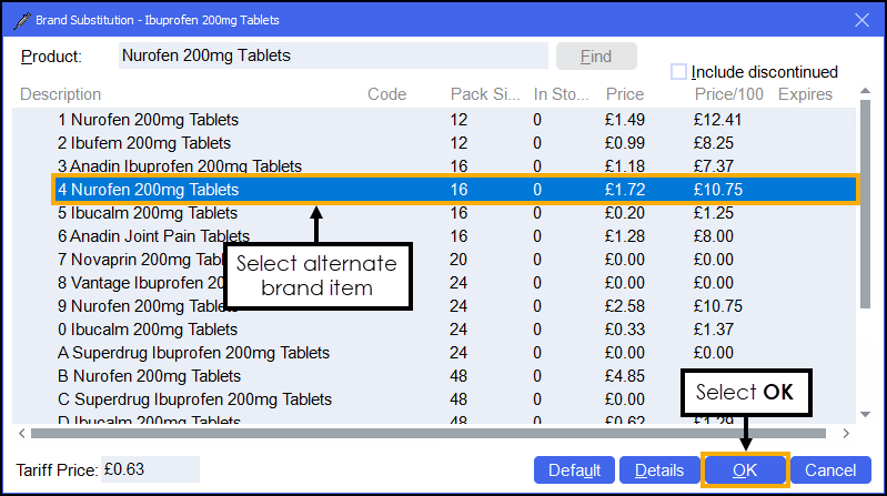 Training Tip - In this example where Ibuprofen 200mg Tablets (16) are prescribed, Pharmacy Manager will dispense Nurofen 200mg Tablets (16) instead.To select a different item select Find