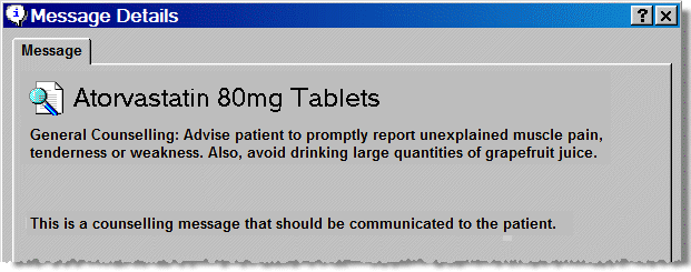 Counselling messages contain recognised advice that should be passed on to the patient, typically to ensure safeguards are adhered to when taking the medication or to report possible problems that arise.