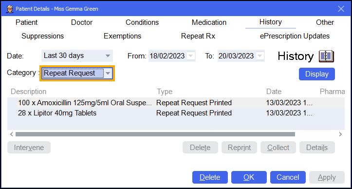 Repeat requests display on the Patient Details - History tab, set the Category to Repeat Request in order to filter the list: