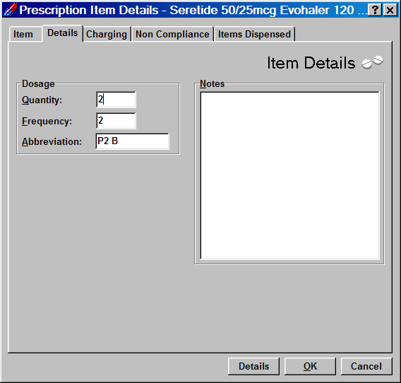 Prescription Item Details shows you all about that particular item on that particular prescription for that patient.