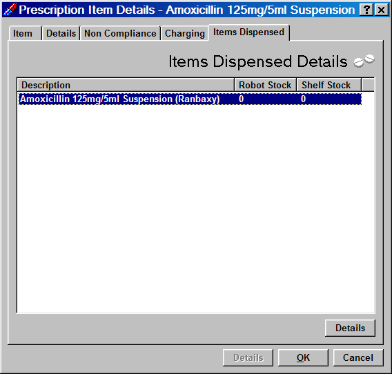 A common feature at the bottom of these tabs is the Details button which, when clicked, will provide more information about the dispensed item.