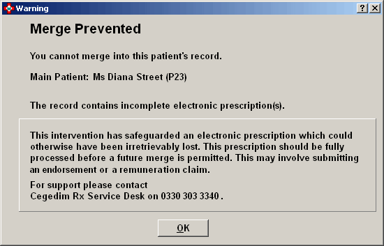 When you attempt to undertake such a merge, the system will intervene, safeguarding an electronic prescription which otherwise would have been irretrievably lost along with your ability to submit a successful reimbursement claim.