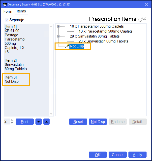 . This will add a corresponding Not dispensed reference on the Dispensary supply screen in the last position on both the left pane, the list of endorsements to be printed, and the right pane, the list of items:
