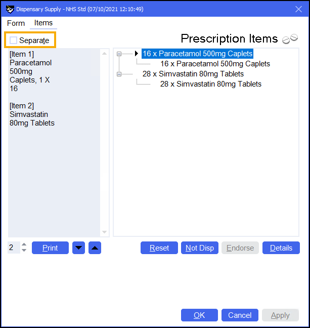 Place a tick next to Separate to mark the prescription accordingly when the endorsement is printed.
