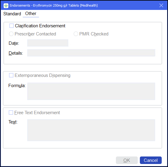 Select the Other tab to access the endorsement options relating to Clarification Endorsement, Extemporaneous Dispensing and Free Text Endorsement: