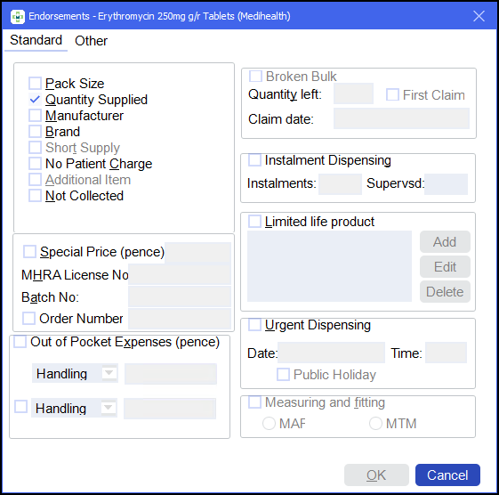 When additional endorsements are permitted for the product dispensed, check boxes are enabled. If a check box is disabled, that particular endorsement is not permitted. In the images below, for example, measured & fitted would not be an applicable endorsement to a cream or ointment prescription item.