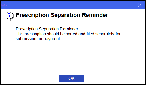 If you have activated prescription separation, the following alert displays after you have entered a valid out of pocket expense endorsement.
