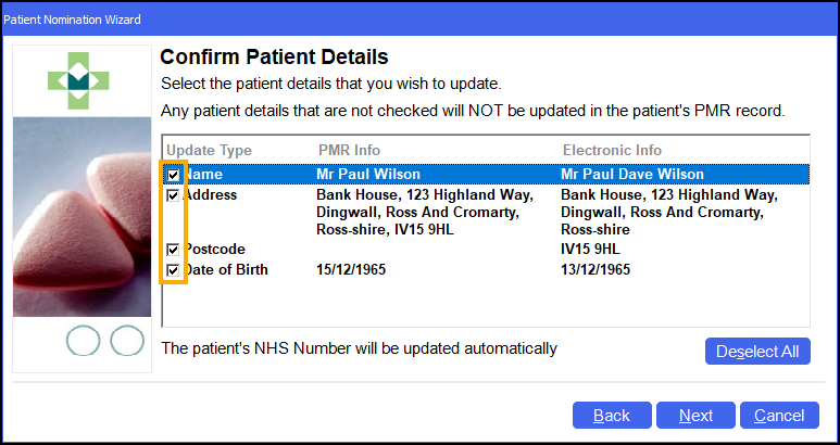Select the tick boxes to update the information from the electronic patient record to the local record in Pharmacy Manager.