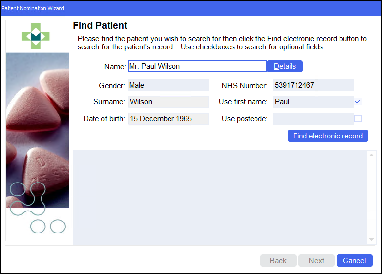 and the patient's details display on the Patient Nomination Wizard - Find Patient screen. - Select Find electronic record