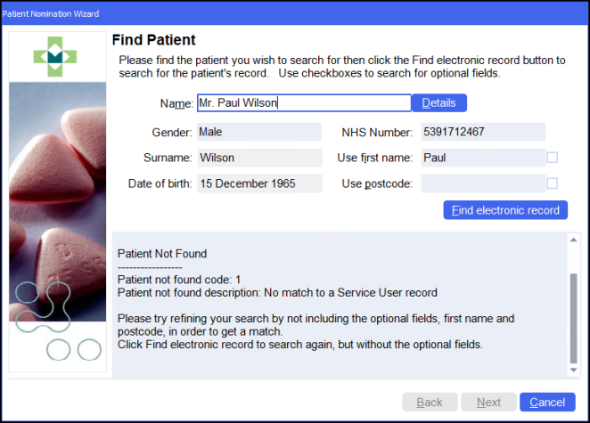 If no patient match is found, Pharmacy Manager suggests a further search without using the first name and postcode as search criteria.