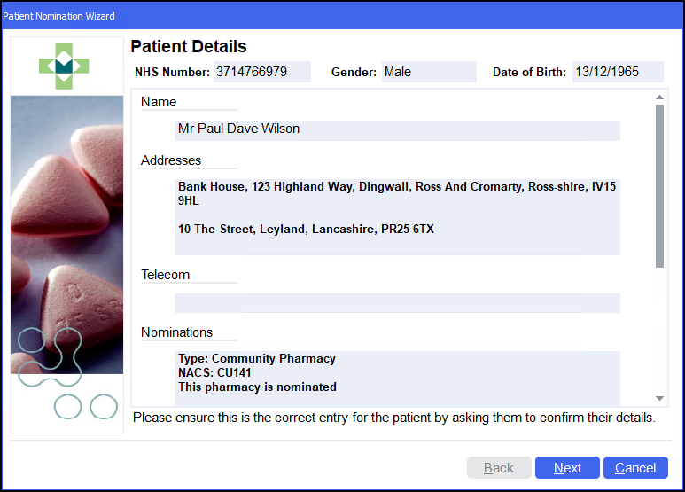 . - The Patient Nomination Wizard - Confirm Patient Details screen displays.