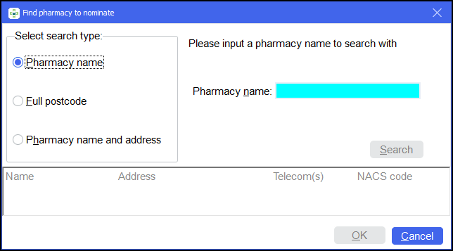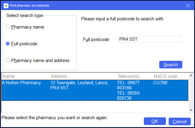 . A list displays pharmacies that match your search criteria, select the pharmacy required and then select OK