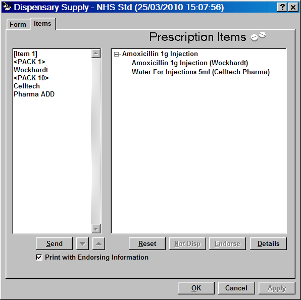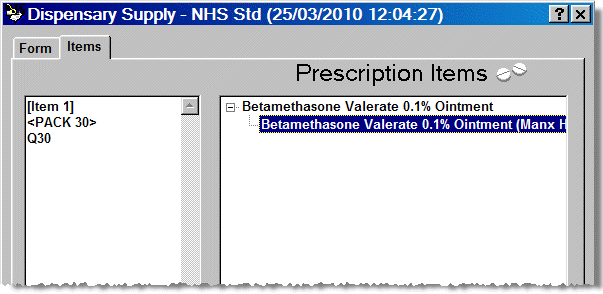 For example, if there were eight items initially spread over three prescriptions, the item numbering through the Patient selection wizard and the Dispensary tab would be 1, 2, 3 followed by 1, 2, 3 again, followed finally by 1 and 2. However, on the Prescription Items tab where endorsements are reviewed and amended, the items would be listed as 1 to 8.