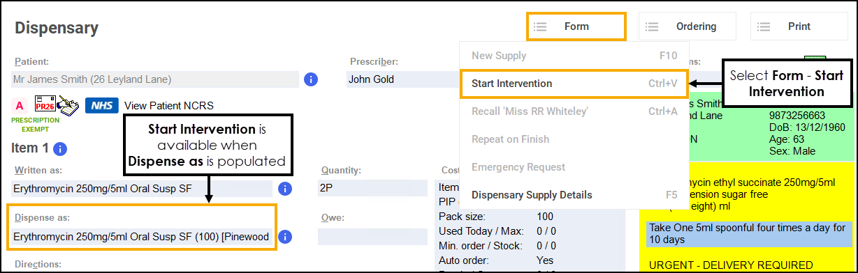 Once Dispense as is populated, you can select Form - Start Intervention or press Ctrl + V on your keyboard.