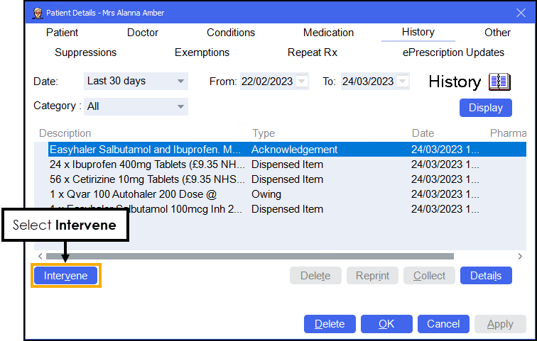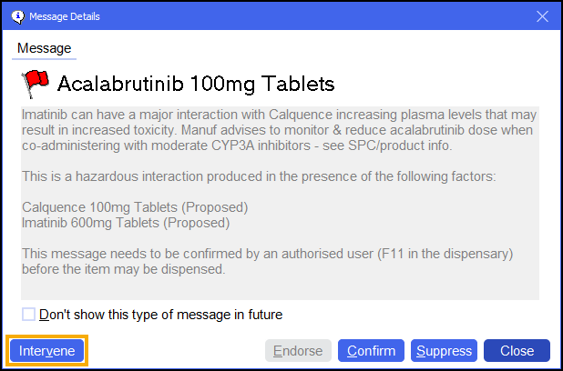 Starting an Interaction Intervention from a Warning on the Dispensary screen