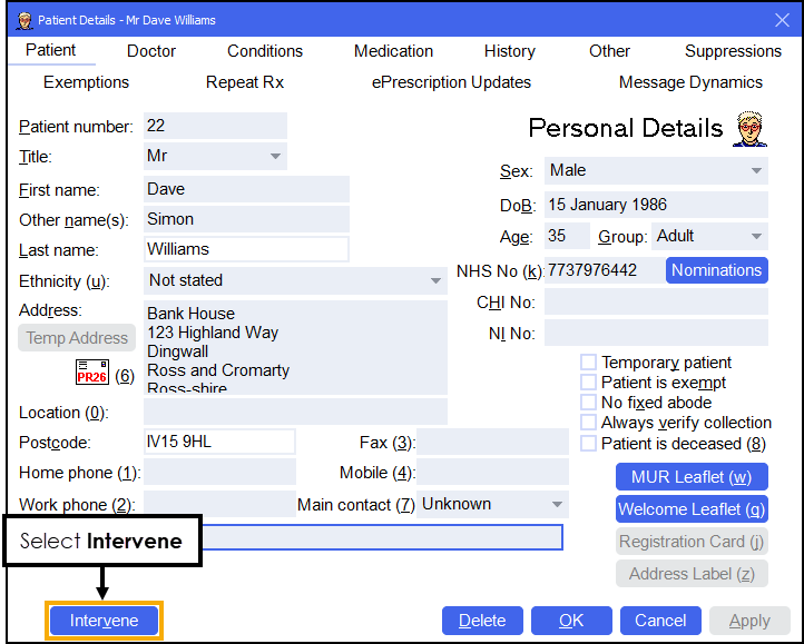 Navigate to the Patient tab and select Intervene