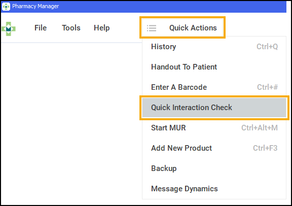 From the Pharmacy Manager Toolbar, select Quick Actions - Quick Interaction Check.