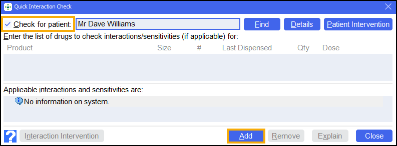 The Quick Interaction Check screen displays. Select Check for patient
